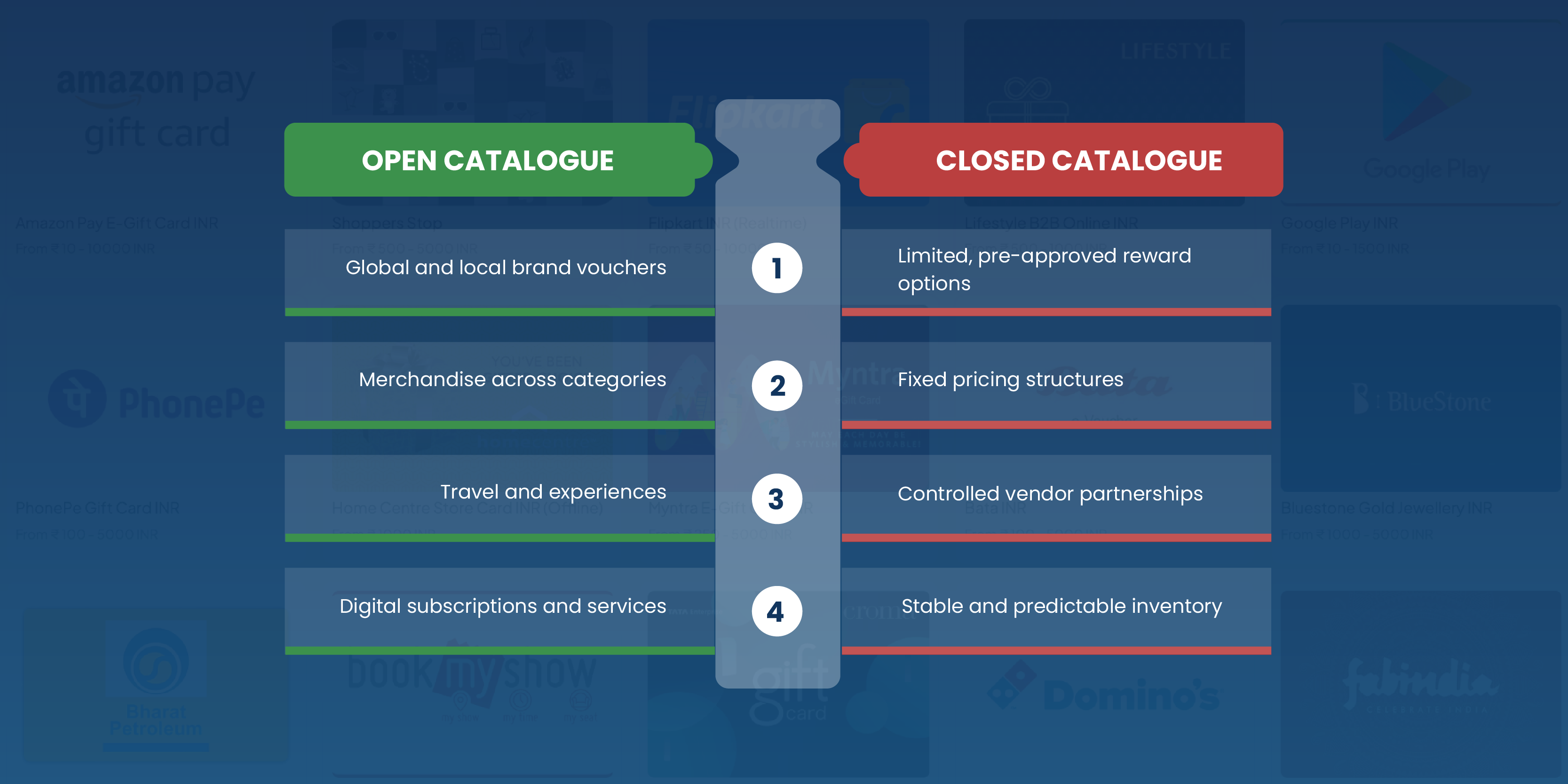 An open reward catalogue offers unlimited choice across multiple brands and categories. A closed catalogue restricts options to a curated, pre-approved set of rewards.