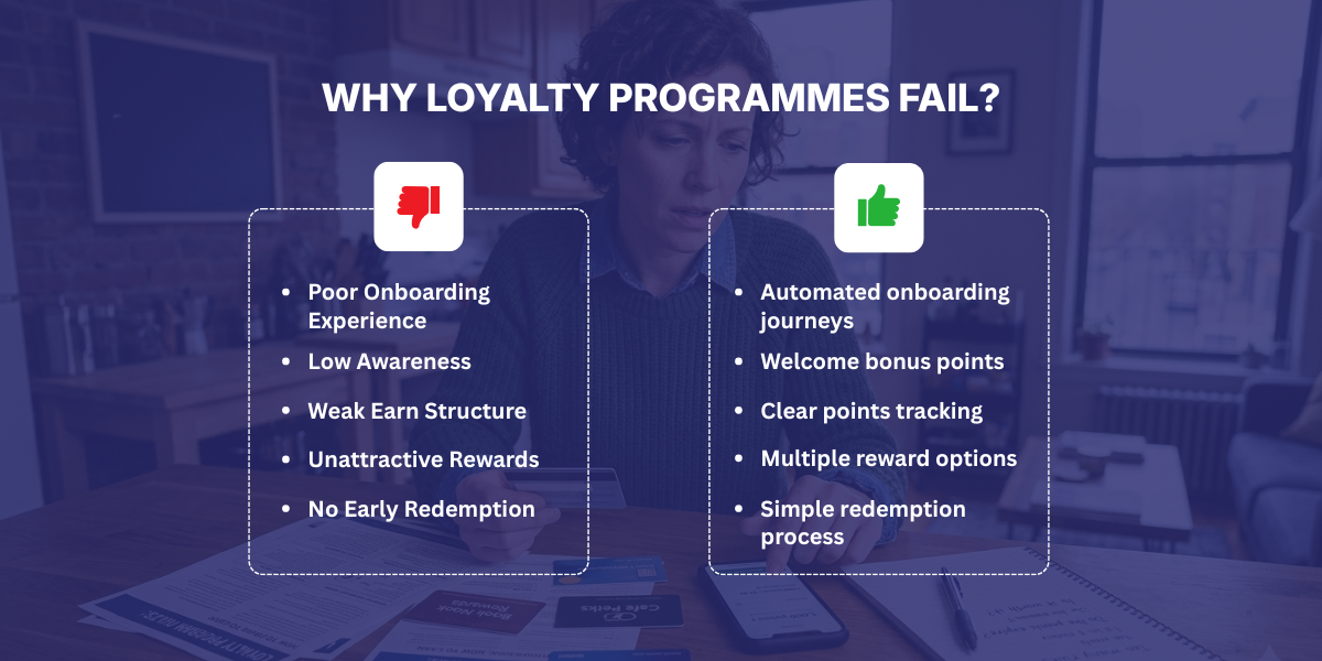 Most loyalty programmes fail in the first year because customers do not understand the programme, do not see value quickly, or do not engage early. Poor onboarding, low awareness, complicated earn structures, and weak reward relevance are the most common causes of early failure. Structured platforms and clear communication significantly improve adoption and long term engagement.